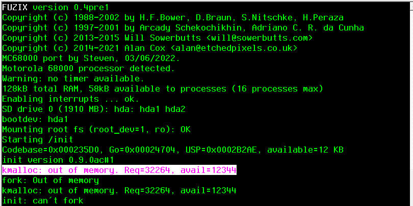 | Porting FUZIX | A project log for 68000 minimal homebrew computer | https://hackaday.io/project/179200-68000-minimal-homebrew-computer/log/202912-porting-fuzix |